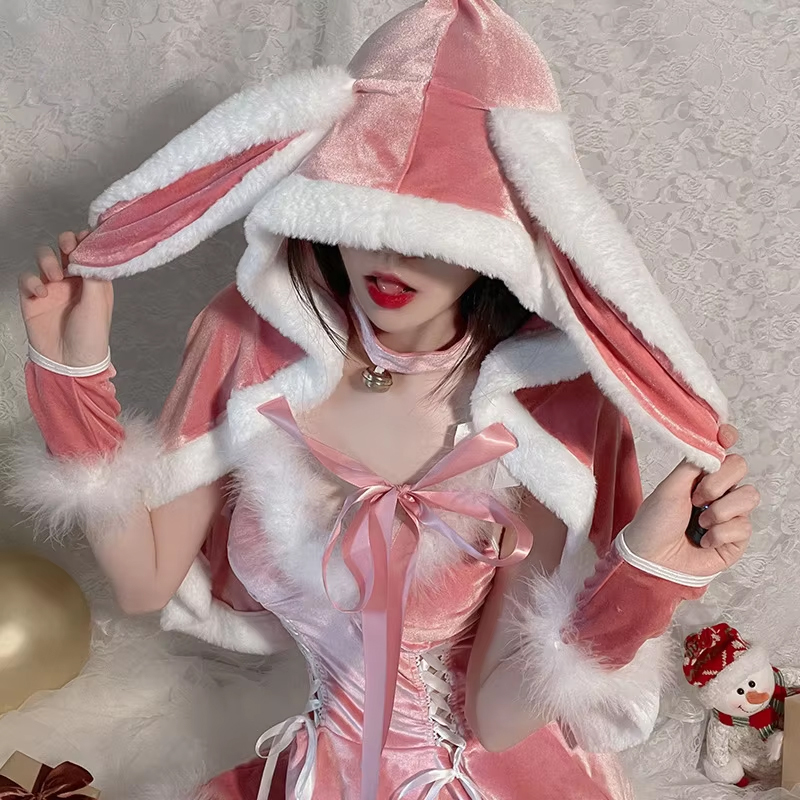 クローク(cloak/外套・マント)は柔らかなファーをあしらったフード付きで、長いバニーイヤーをデザインし可愛らしく、ホリデーシーズンならではの遊び心をプラスしています。ふわもこ素材とピンクカラーが可愛らしさを引き立て、特にクリスマスシーズンには最適なバニーコスチュームパジャマです。